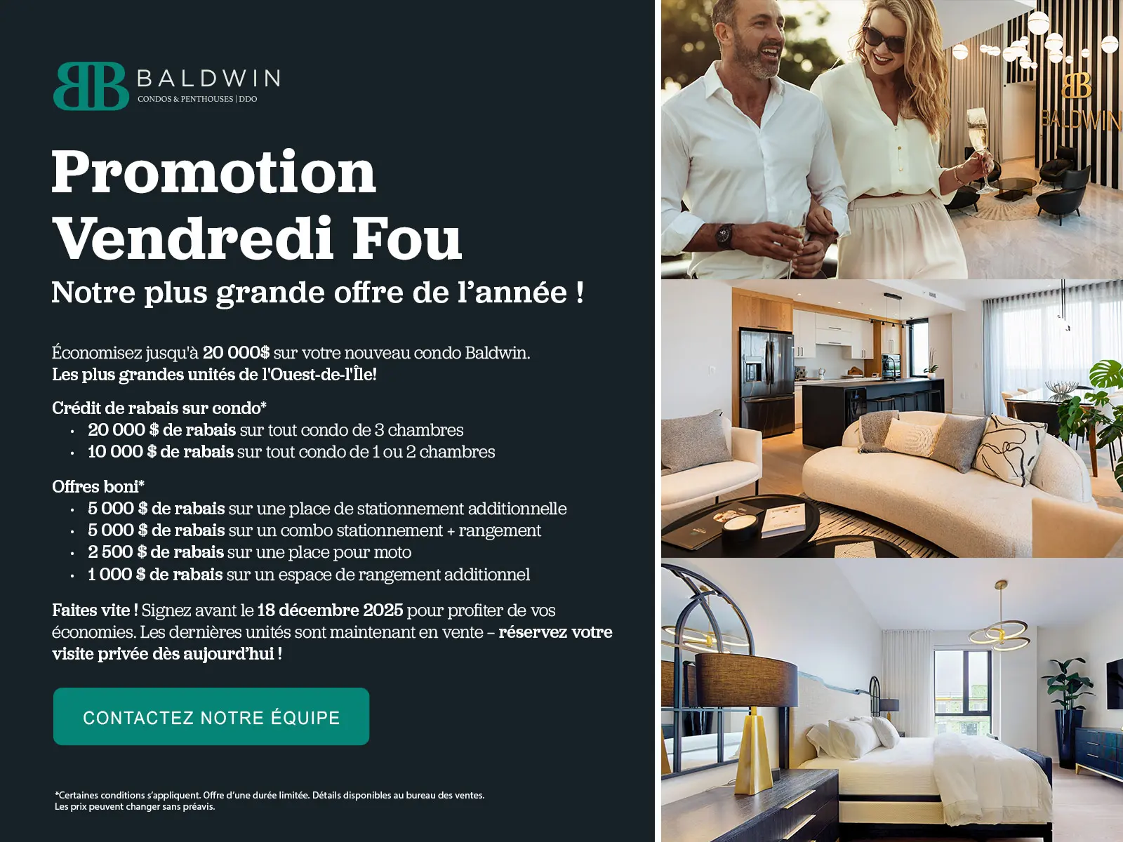 Située sur le boulevard Saint-Jean à Dollard-des-Ormeaux, la Phase 2 du projet Baldwin Condos & Penthouses profite d’un emplacement privilégié près des services et des commodités, dont le centre commercial Fairview Pointe-Claire.